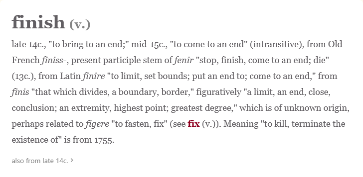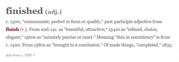 To finish something is an anticipated action. Because of this, it can also be an anxiety-inducing process. To finish is to end something, sometimes in a very final or severe way, such as to finish living or, more pop culturally, to execute a finishing move in a combat game. A finish is an end–or at least a boundary. Crossing a finish line ends the journey. It divides the now from the what-will-be-after.
