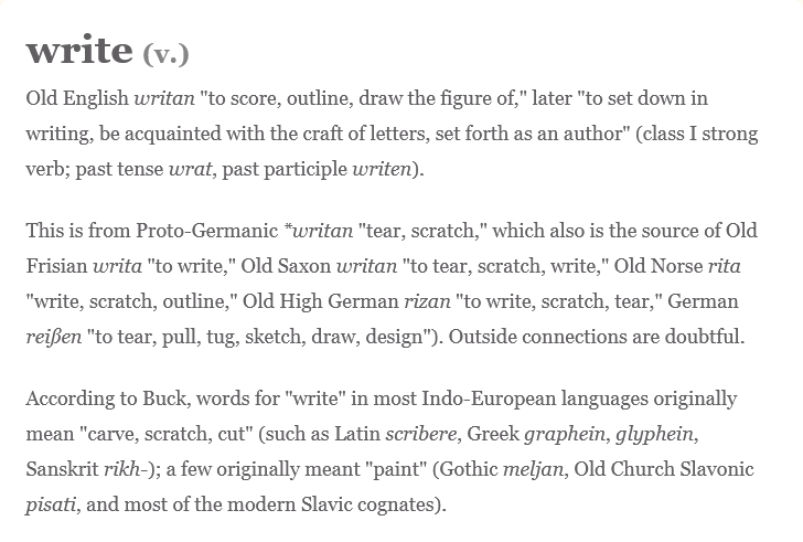 As people, we often want to reach back to find some sense of stability. Sometimes this makes sense–if you're falling on suddenly unstable ground, reach for what you know to be safe. Culturally, this can lead to some wildly unsettling movements and a deeply frustrating dedication to nostalgia for misremembered history. Linguistically, though, it can be a playground for instrospection. If we trace "writing" far enough back (far enough that we must note these connections are often qualified with "might form" or "might be" the source or root of modern words), we end up at the reconstructed Proto-Indo-European (PIE) roots, such as “sker-" which gives us words such as share (n.), “portion of something belonging to an individual,” or share (v.), “to enjoy or suffer (something) with others...to divide one’s own and give part to other" or even "confess one’s sins openly."